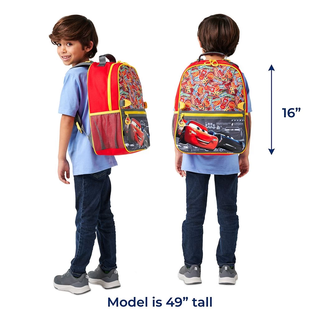 Lightning McQueen and his racetrack rival Jackson Storm go wheel to wheel on the front of this Cars backpack! Spacious enough for all your young speedster’s back-to-school essentials, this high-octane carryall has such adaptive features as zipper pulls and detachable straps. Pair it with the coordinating Cars lunch box, water bottle and zip-up stationery kit for a winning combination.