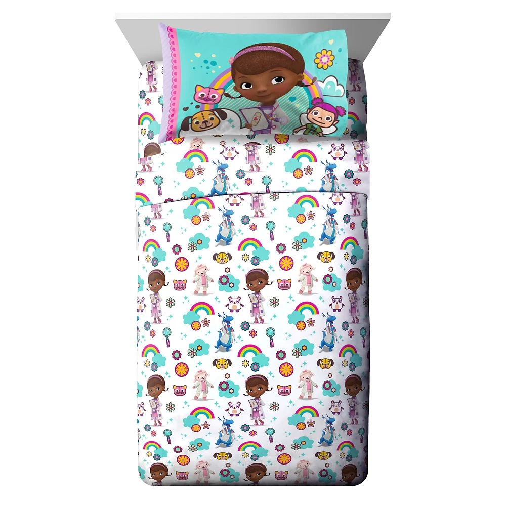 - Fitted and flat sheets feature an allover pattern of Doc, Stuffy, Lambie, rainbows and more