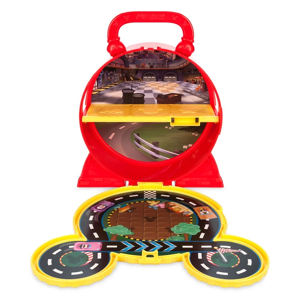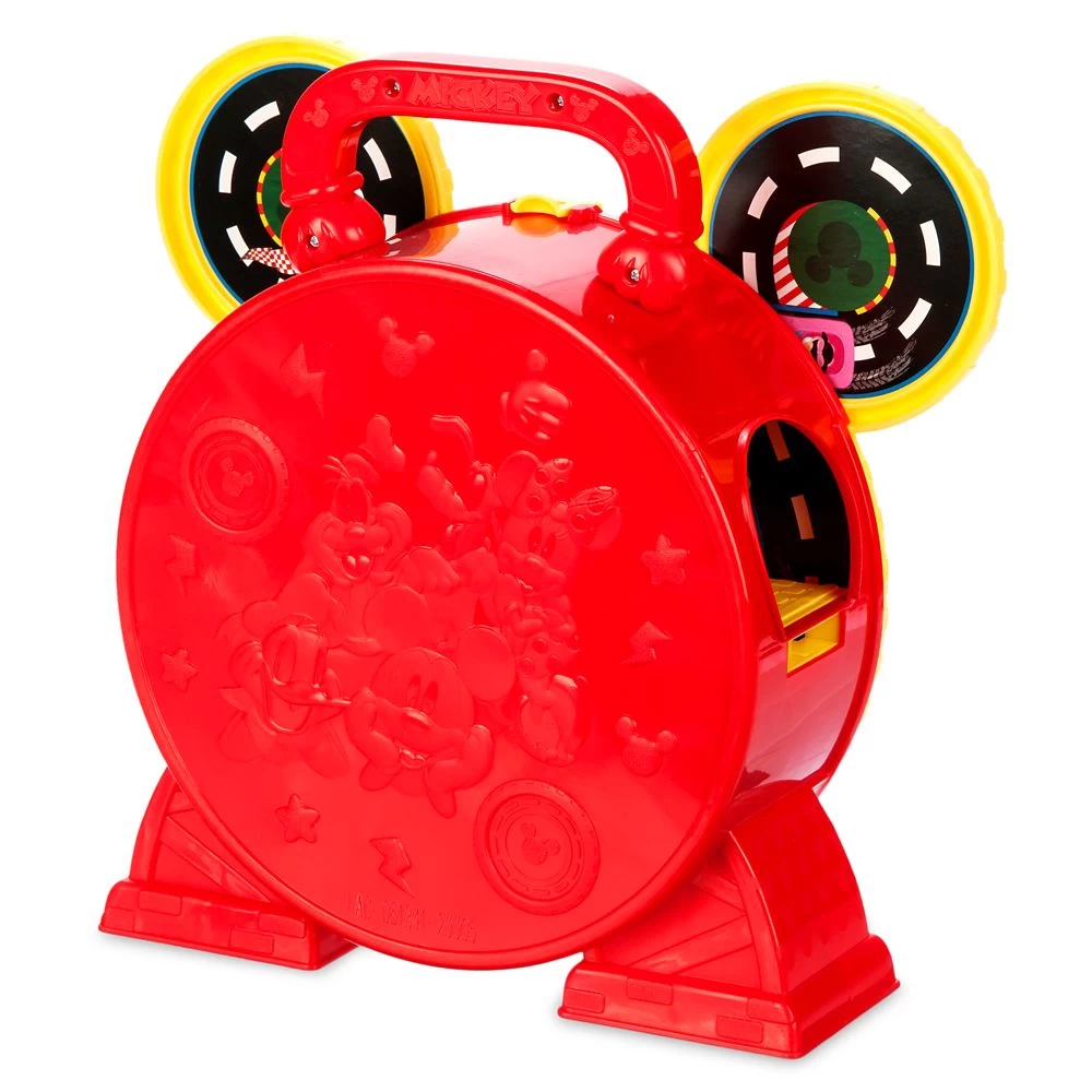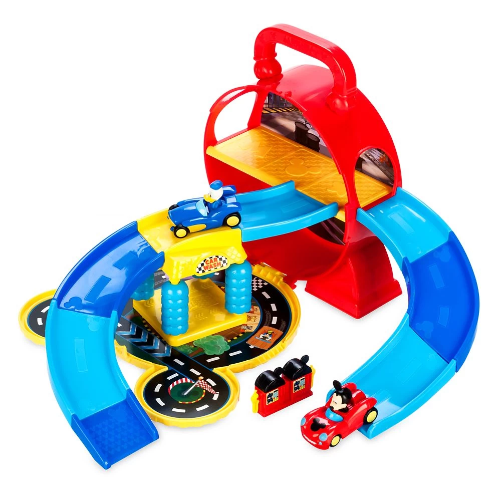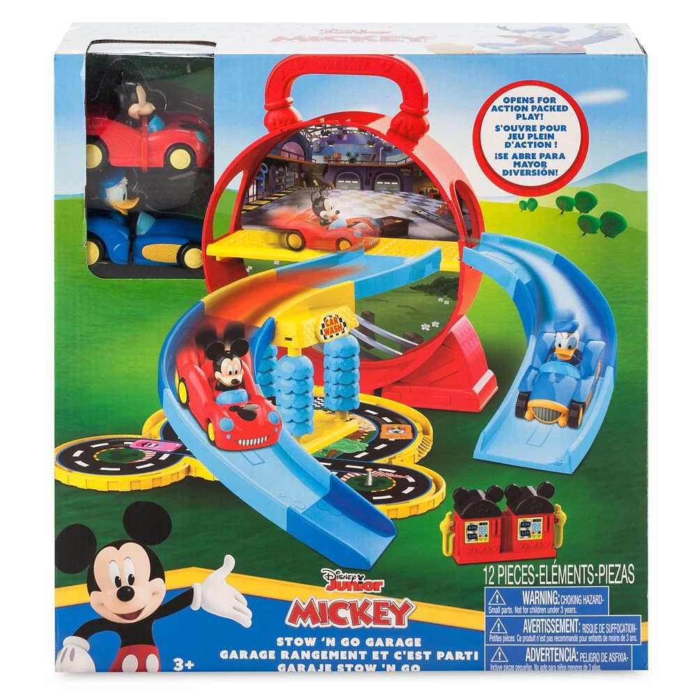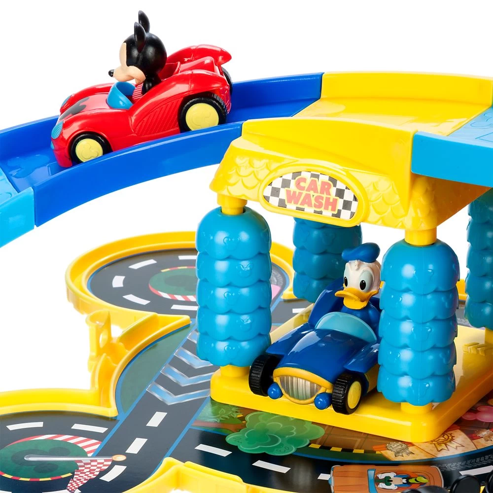 - Includes Mickey and Donald in their cars, track pieces, Mickey icon roundabout, carwash, gas pumps and Mickey icon carry case