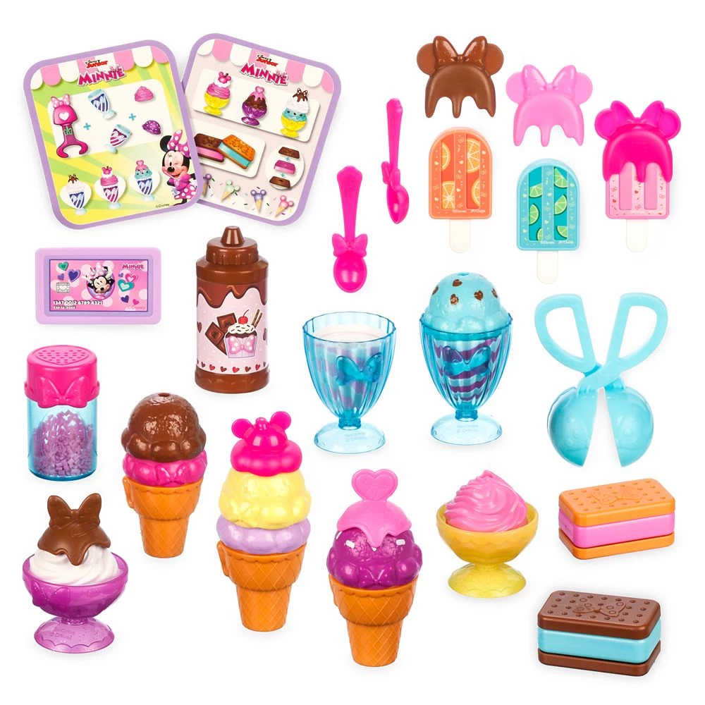 - Includes ice cream cart with play milkshake maker, six play scoops of ice cream, two play whipped cream toppings, three play ice cream toppers, three play ice pops, three play ice pop toppers, four play ice cream sandwich cookies with two ice cream fillings, three play ice cream cones, two play ice cream bowls, two spoons, two milkshake glasses, ice cream scoop, chocolate syrup bottle, sprinkle shaker, pretend credit card, pretend credit card reader and two menus