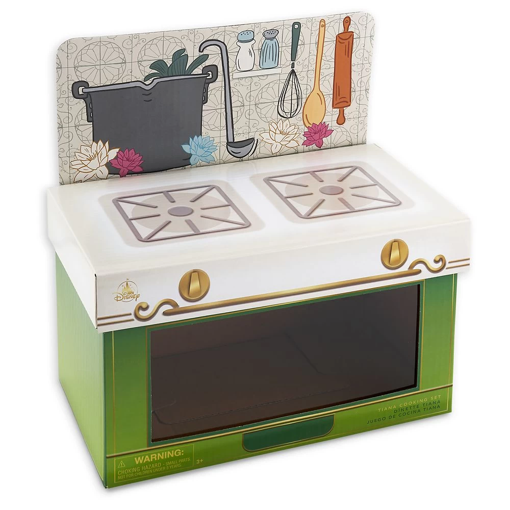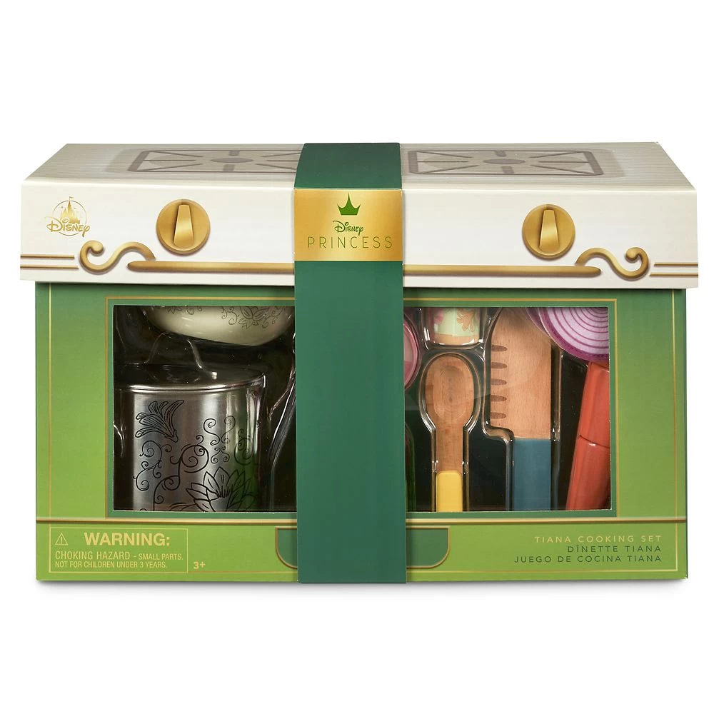 Your little chef can cook up some imaginative fun with this 12-piece Tiana cooking play set. All the fixins are here to create a tasty gumbo including ingredients, utensils, a pot and lid, bowl, spoon, and placemat. The pretty box looks like a stove complete with a pop-up backdrop so playtime can really get cooking.